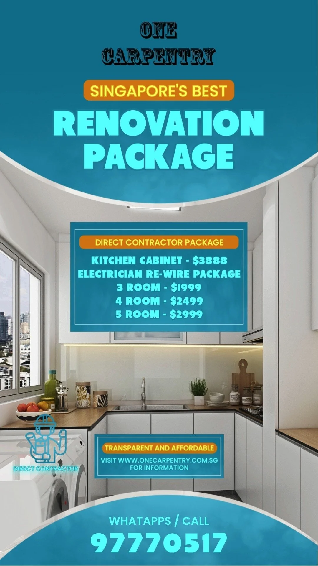 One Carpentry is a direct carpentry contractor in Singapore, providing kitchen cabinets, wardrobes and built-in storage without middleman markup. We focus on practical solutions, reliable workmanship and affordable pricing for HDB and BTO homes.